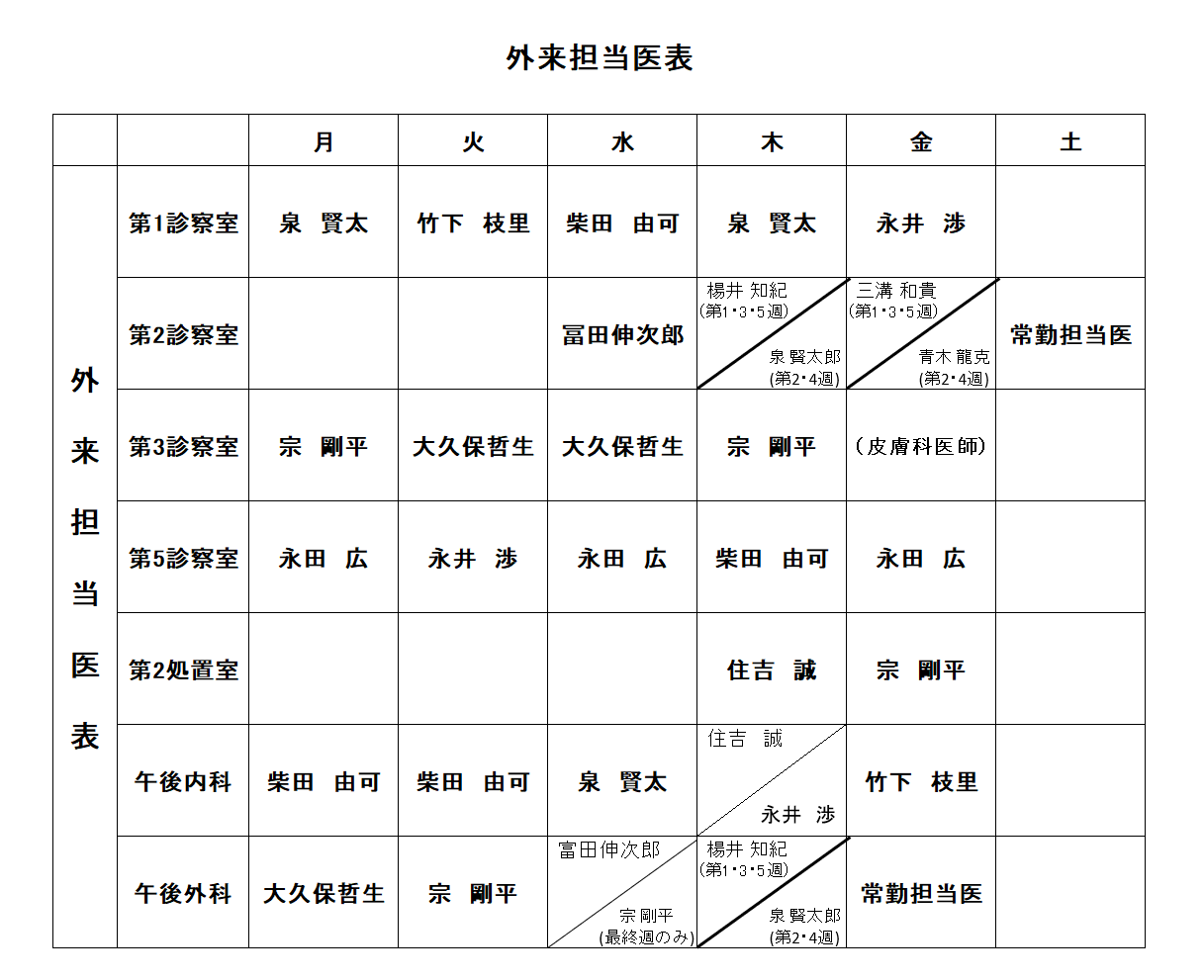 | 2026-03-26 | 担当医表 | 外来担当医表と医師の不在のお知らせ |
